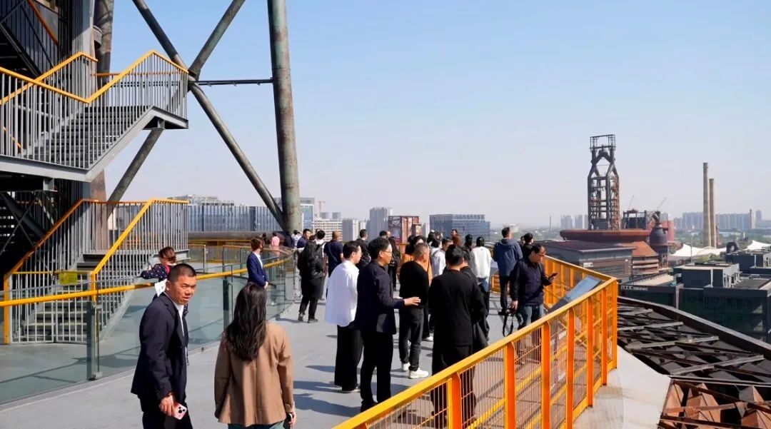 随后,企业家们登上三高炉40米观景平台,俯瞰整个园区。这里不仅是工业遗存改造的典范,更是新时代城市更新的成功实践。工作人员介绍了功勋高炉的改造和周边新业态的分布情况,展示了如何将具有历史意义的工业遗址与现代城市功能相结合,形成创新型的产业和文化集聚地。这一转型创新的典范案例,让企业家们认识到传统工业基地在新时代的发展潜力,也感受到“老工业、新活力”的深刻内涵。
